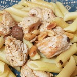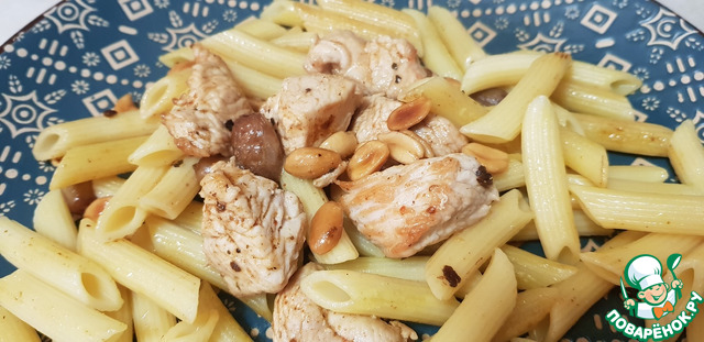 2. Обжариваем до золотистой корочки. Грибы разрезать на 4 части и добавить туда же, обжарить 2 -3 мин., добавить коньяк и еще 3 мин., затем сок лимона. Потушить, добавить зелень и мускатный орех, тушить еще пару минут. Готово.