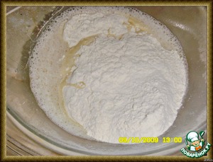 Добавить теплое молоко и растопленное и охлажденное масло, взбить все вместе.