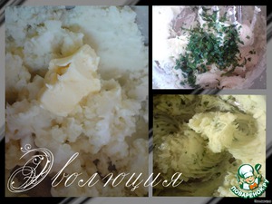 Далее мнем картофель толкушкой, и вливаем туда сметанку. Все перемешиваем. Кидаем кусочек масла и зелень, взбиваем миксером. Получается практически крем:-) Очень вкусная картошечка!