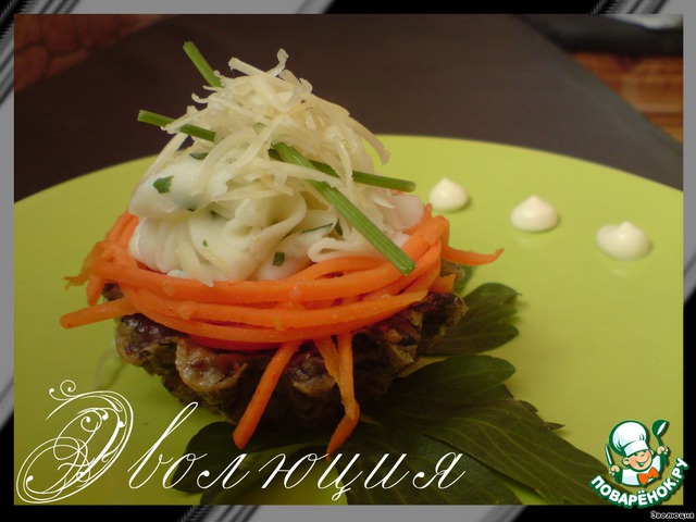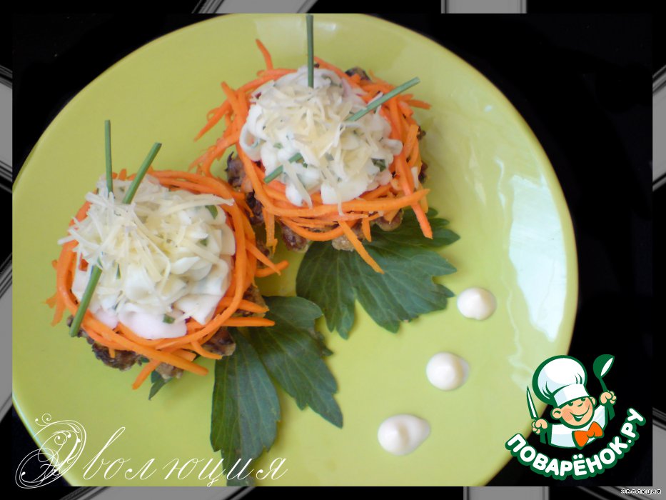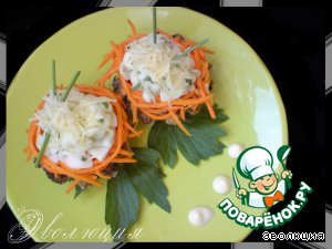 На грибную корзинку выкладываем кольцом корейскую морковку.