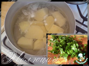 Картофель отварить в подсоленной воде, зелень мелко нарезать.