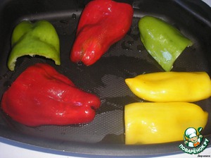 Перец разрезаем пополам, чистим. Выкладываем на противень и смазываем растительным маслом. Отправляем в разогретую до 180 градусов духовку на 20 минут. -