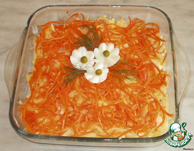 Получается приятное сочетание отварной печени и корейской моркови. Вкус у салата очень нежный и немного пикантный.