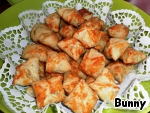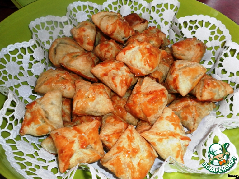 Ну тогда приступаем к художественной лепке. Я ленива, поэтому тесто не раскатываю. Просто режу каждый пласт на 4 квадрата. Из двух пластов получилось 8 квадратов. Каждый квадратик растягиваю руками. И опять я не права — нужно раскатывать в одном направлении. Но я как подумаю, что потом мыть еще и скалку, и доску... Короче, растянули мы с вами тесто и кладем туда ложку нашей начинки. Большую, с верхом. Соединяем углы теста, защипываем края.