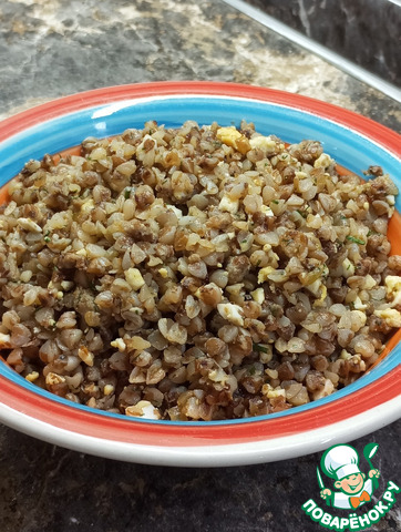 Гречневую крупу перебрать и залить водой. Поставить на плиту и варить на сильном огне до кипения, затем посолить и уменьшить температуру до средней и варить 15 минут при закрытой крышке. По истечению времени уменьшить огонь до минимума и варить еще минут 5-7 до полного впитывания воды. В это время сварить яйца и размять их вилкой до мелкой крошки...