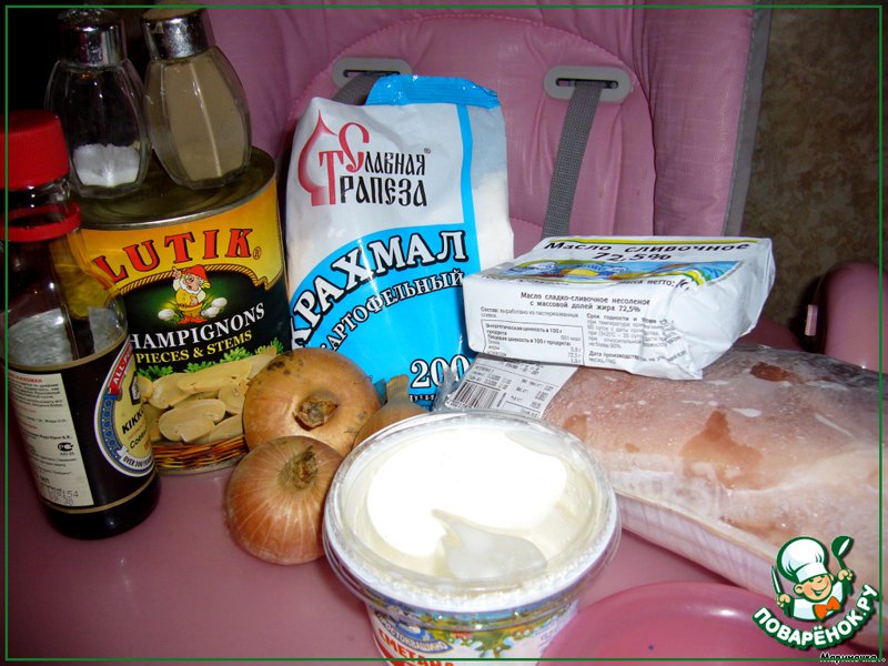 Мясо нарезаем крупными кусками и обжариваем в кастрюле на сильно разогретом масле. Добавляем нарезанный полукольцами лук и грибы. Продолжаем жарить при открытой крышке, помешивая. Далее солим, перчим, добавляем ложку соевого соуса и все перемешиваем. Добавляем сметану и заливаем 0, 5 л воды. Закрываем кастрюлю крышкой и ставим ее на огонь, до готовности.
