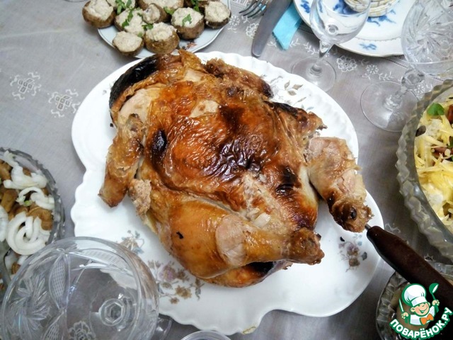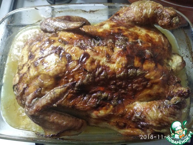 Теперь выкладываем курочку на противень, смазываем майонезом, посыпаем приправкой, наливаем в противень пол-стакана красного вина, и отправляем в духовку на полтора часика. Температура 180 градусов.