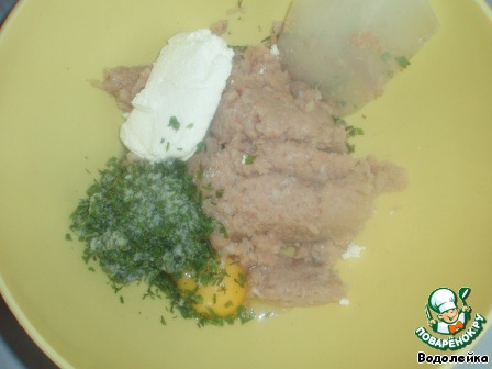 В готовый фарш добавляем творог, зелень, яйцо. Хорошо вымешиваем + специи (соль, перец и любые приправы для рыбы).
