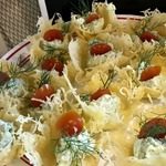 Фету (можно брынзу или творог) взбить в блендере, добавить кусочками нарезанное авокадо, укроп, полить соком лимона, поперчить, перемешать и разложить по одной чайной ложке в тарталетки. Чеснок в начинку я добавлять не стала, так как он присутствует в сырных тарталетках, ещё, по желанию, в начинку можно мелко нарезать помидоры. Украсить зеленью наполненные тарталетки и подать на стол, приводя в восторг Ваших гостей.
