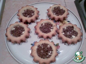 Теперь крошим мякиш из серединок и оставщийся тёртый шоколад в оставшийся крем, перемешиваем и раскладываем горкой на тарталетки.