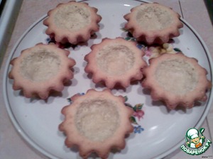 Формочки для тарталеток смазать растительным маслом, положив на дно промасленную бумагу, разложить тесто и выпекать в разогретой духовке при температуре 180-200 градусов.