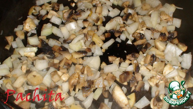 • Грибы и вторую половину луковицы мелко нарезать и обжарить на растительном масле.