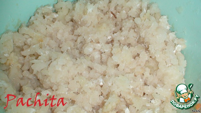 • Пропустить через мясорубку филе рыбы (я использовала рыбу конгрио - креветочная рыба. Рекомендую!) вместе с половинкой луковицы и размоченной в молоке булочкой.