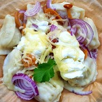 4 Заливаем соусом: сметану смешиваем с мёдом, горчицей добавляем немного тёплой кипячёной воды, чтобы соус был не очень густым, и заливаем наши пельмени.