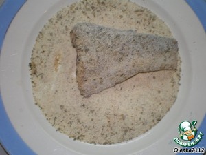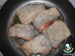 Запанированную рыбку кладём в разогретое масло и слегка обжариваем с двух сторон.Обжаренную рыбку укладываем в огнеупорную форму.