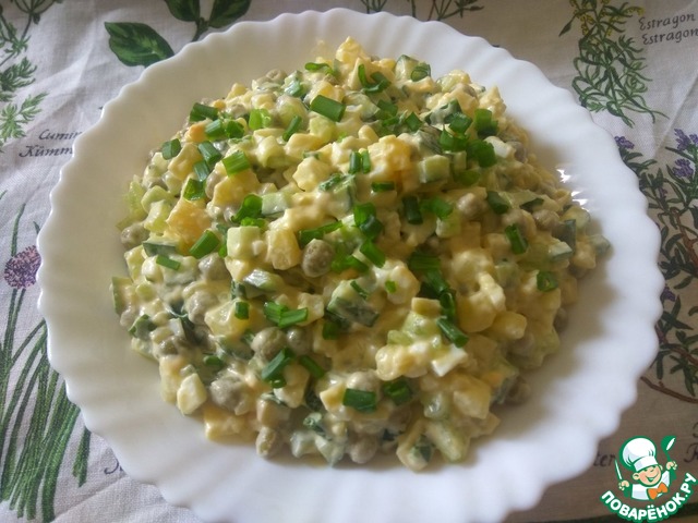 Огурчики такими же кубиками, как и картофель. Огурчики лучше взять солененькие