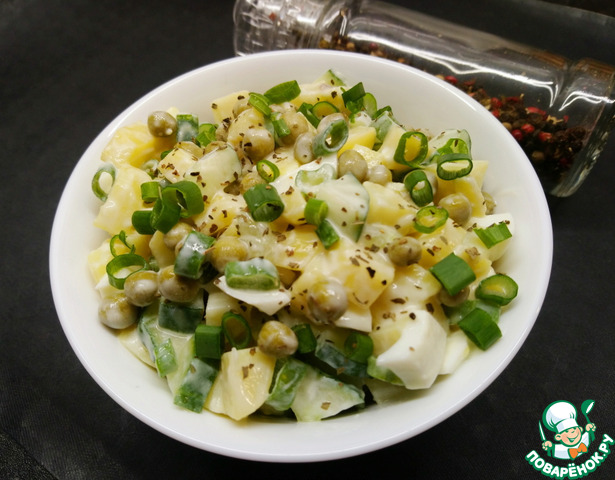 С горошка слить жидкость и добавить к прочим ингредиентам