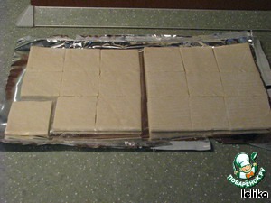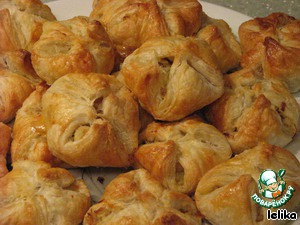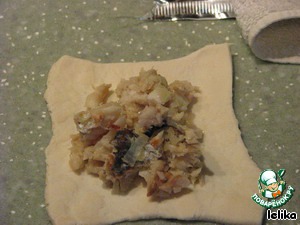 Слоеное тесто, предварительно, достаем из холодильника и даем ему оттаять. Нарезаем произвольно. У меня в этот раз расстегаи были крупными (не на один укус - что-то лениво мне было :-D), поэтому пласт поделила на 9 частей.