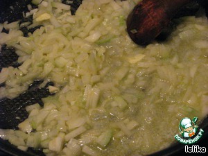 На сковороде растапливаем половину сливочного масла и обжариваем лук до прозрачности
