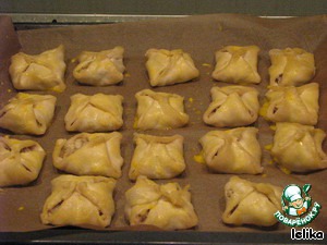 Выкладываем на противень, покрытый пергаментной бумагой и смазываем взбитым желтком (можно для облегчения смазывания разбавить его парой ложек воды)