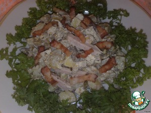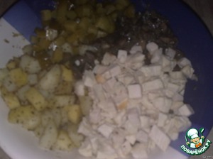 Картошку соединяем с грибами, курицей, огурцами, ветчиной