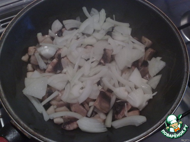 Шампиньоны чистим, режем небольшими кусочками. Лук режем полуколечкам -
