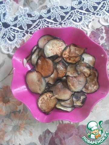 Баклажан нарезать кружочками (не очень толстыми и не тонюсенькими), обжарить. Если баклажан горчит - предварительно пересыпать его солью, оставить минут на 20, после чего сполоснуть водой.