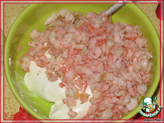 Креветки чистим, режем мелко (оставим 6-8 штук на украшение), заправляем сыром. Если любите паштеты - пропустите креветки и сыр через блендер.