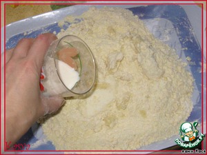 Делаем ямку, постепенно выливаем молоко и замешиваем крутое тесто