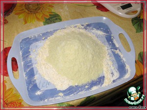 Отмеряем стаканами (у меня для этого тонкие стаканчики) 1 стакан муки и 1 хлопьев. Хлопьев ушла вся пачечка, так что знаю вес :). Масло рубим с мукой. Приспособилась делать это в подносе - стол чистый остается, собирать кучку муки легко, вымыть поднос 2 минуты.