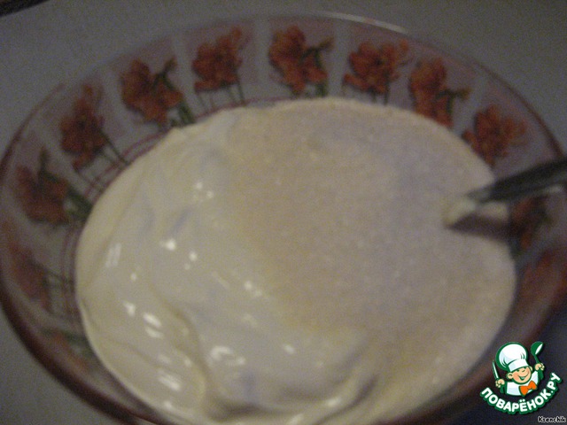 Тем временем сметану перемешиваем с сахаром (70 г.) и оставляем до полного растворения сахара.