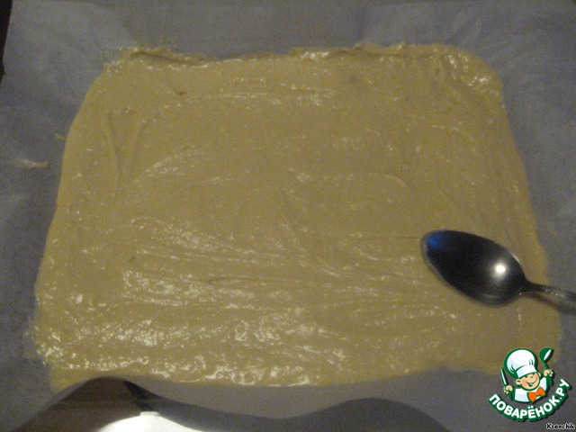 Выкладваем его на лист, застеленный бумагой для выпечки (можно смазанный маслом) и разравниваем.