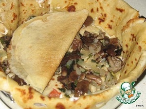 • Сверху блин. На него грибную начинку. Опять блин. Так чередовать блины и начинки.