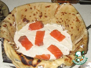 • Разъемную форму смазать маслом, выложить внахлест 5 блинов, чтобы часть блина свисала из формы. На низ положить блин, который будет служить основой.