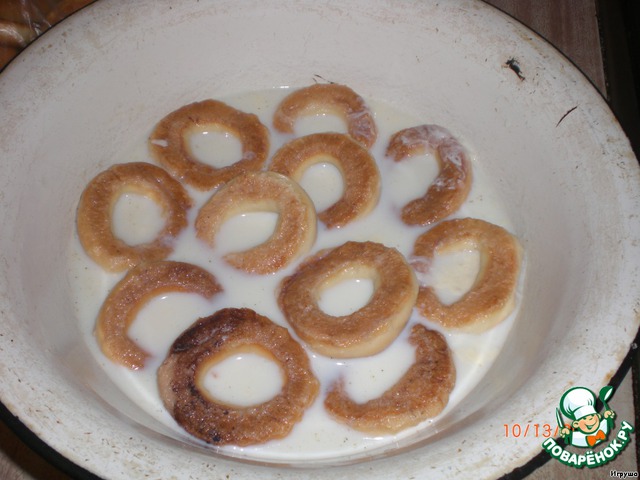 В горячем молоке вымочить бублики порционно по 5 минут с каждой стороны.