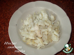 • Достаем рыбку. Когда остынет, режем кусочками, не очень мелко.