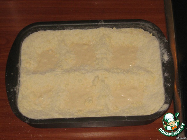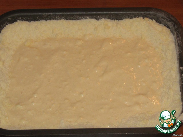 В форму выкладываем 2/3 теста, сверху выкладываем начинку, оставшееся тесто как бы подсыпаем на края,