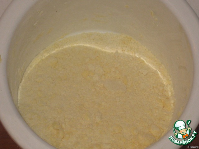 Масло сливочное рубим мелко, добавляем муку и половину порции сахарного песка.
