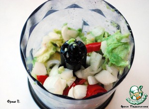 Пол-луковицы, авокадо и чили смешать в блендере, посолить.