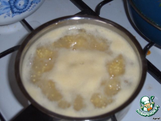 В кипящую воду добавляем промытое пшено, варим на слабом огне до полуготовности (7-8 минут).