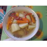 Мясо положить в кастрюлю, залить водой так, чтобы покрывала все мясо, добавить луковицу, соль, перец и варить до готовности. По необходимости снимать пенку, чтобы бульон оставался прозрачным. Если все же не получилось, бульон надо процедить. Мясо варить около часа. После того, как мясо сварится, выбросьте луковицу. Очистите картофель и добавьте к мясу, не нарезая, целыми. Добавьте куркуму на кончике ножа, полусваренный горох и варите до готовности. Затем добавить 1 ложку томатной пасты или мелко нарезанного помидора. Варить еще минут 5 -10.