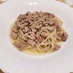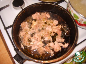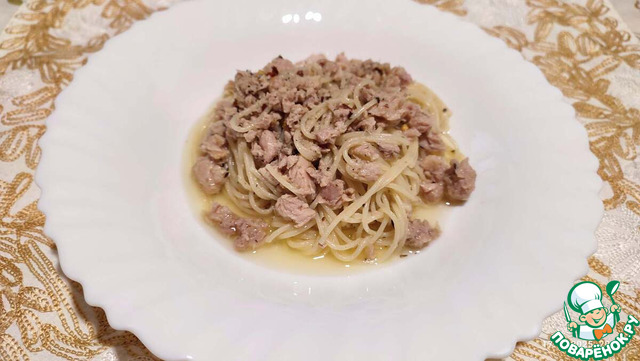 1. Варим макароны. Тем временем выкладываем тунца вместе с соком из банки на разогретую сковороду. Прогрейте 3 минуты.