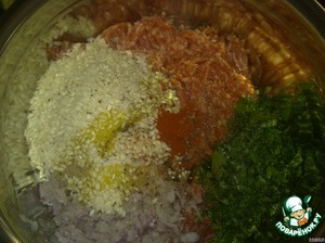 • Подготовить фарш: смешать мясной фарш, лук, зелень, добавить специи (я ещё добавляю немного оливкового масла), немного воды (чтобы начинка не была сухой)