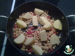 • В посуду, пригодную для запекания в духовке, выложить нарезанные сердцевинки помидор, нарезанный картофель и заранее сваренный нут.