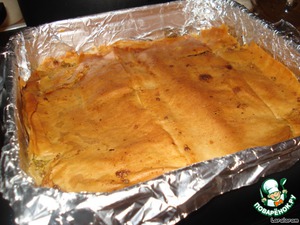 Форму (у меня квадратная размером 22х22 см) смазать тонко маслом и выстелить фольгой - да так, чтоб её края загибались за края формы, смазать фольгу маслом.