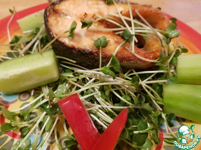 Выложите филе лосося и соевые ростки на подогретое сервировочное блюдо, посыпьте зеленью укропа и полейте образовавшимся в процессе приготовления соусом.