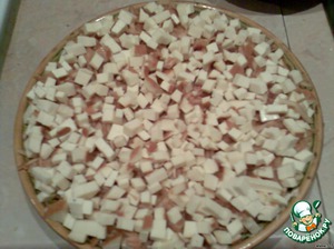 • На яблоки выкладываем копчёный колбасный сыр, порезанный кубиками.