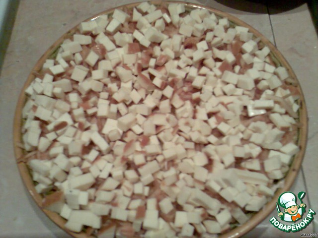 • Посыпать порезанным луком, сверху положить поджаренный на сливочном масле и порезанный кубиками белый хлеб.