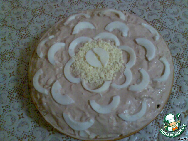 • Варёные яйца мелко рубим(надо оставить для украшения 3 половинки белка и 1/2 желтка)и посыпаем на сыр сверху.