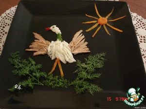 выкладываем из потертого белка голову и туловище,крылья из мяса,можно заменить рыбой.Дальше - как подскажет фантазия.